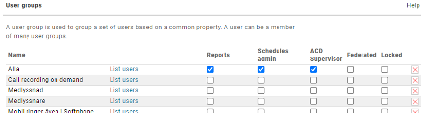 Om du vill kan du aktivera detta på organisationsnivå så att alla kan medlyssna eller bli medlyssnade, men tänk på att då kan vem som helst när som helst gå in och avlyssna sin kollega utan att kollegan ens märker det. Därför styr vi detta med grupper så att vi vet vem som kan medlyssna och vem som kan bli medlyssnad. Which groups are allowed to intrude on calls involving members in Medlyssnad: Which groups are allowed to barge-in on calls involving members in Medlyssnad: Which groups are allowed to barge-in on calls to and from users acting as a member in a function number in Medlyssnad: Which groups are allowed to whisper in on calls involving members in Medlyssnad: Which groups are allowed to whisper in on calls to and from users acting as a member in a function number in Medlyssnad: Which groups are allowed to silent monitor calls involving members in Medlyssnad: Which groups are allowed to silent monitor calls to and from users acting as a member in a function number in Medlyssnad: