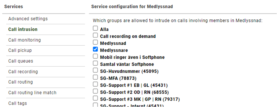 Gå till menyn Services och valet Call intrusion. Längst ned till höger i bilden nedan ser du våra två nyskapade grupper.